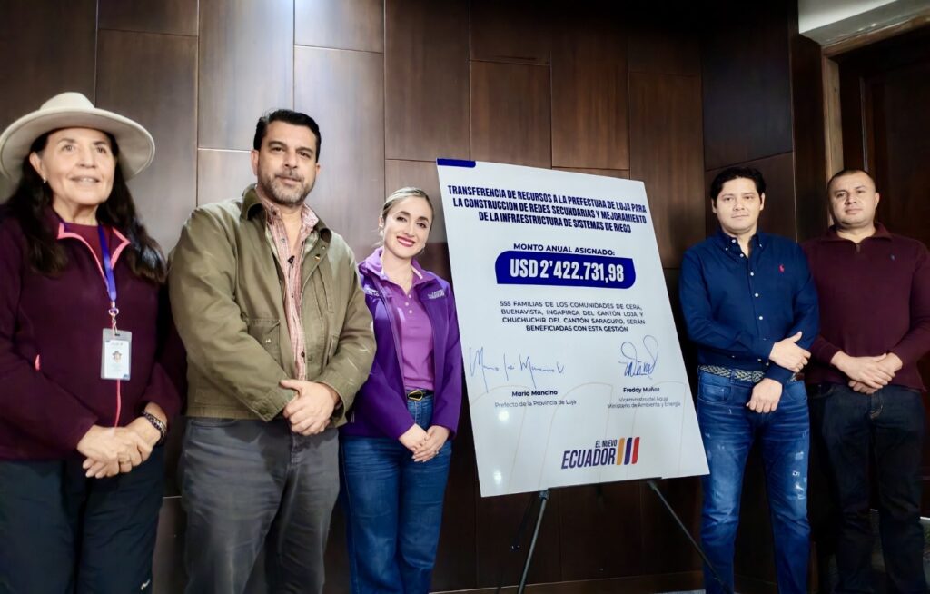 En el ámbito productivo, se habilitaron dos proyectos de riego impulsados por el Gobierno Provincial de Loja y respaldados por el Gobierno de El Nuevo Ecuador, con una inversión de USD 2,4 millones. Estas obras permitirán rehabilitar infraestructura de riego en 382,41 hectáreas, beneficiando a 555 familias agricultoras de los cantones Loja y Saraguro.
